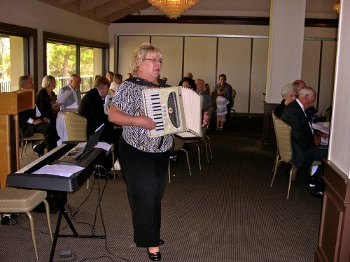 Mrs. Kaie Põhi Latterner leads the audience in song.
