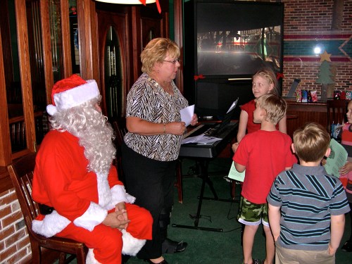 Jõuluvana/Santa assisted by his päkapikk/elf, Kaie Latterner, who summons the children forward. KFES, December 8, 2013
