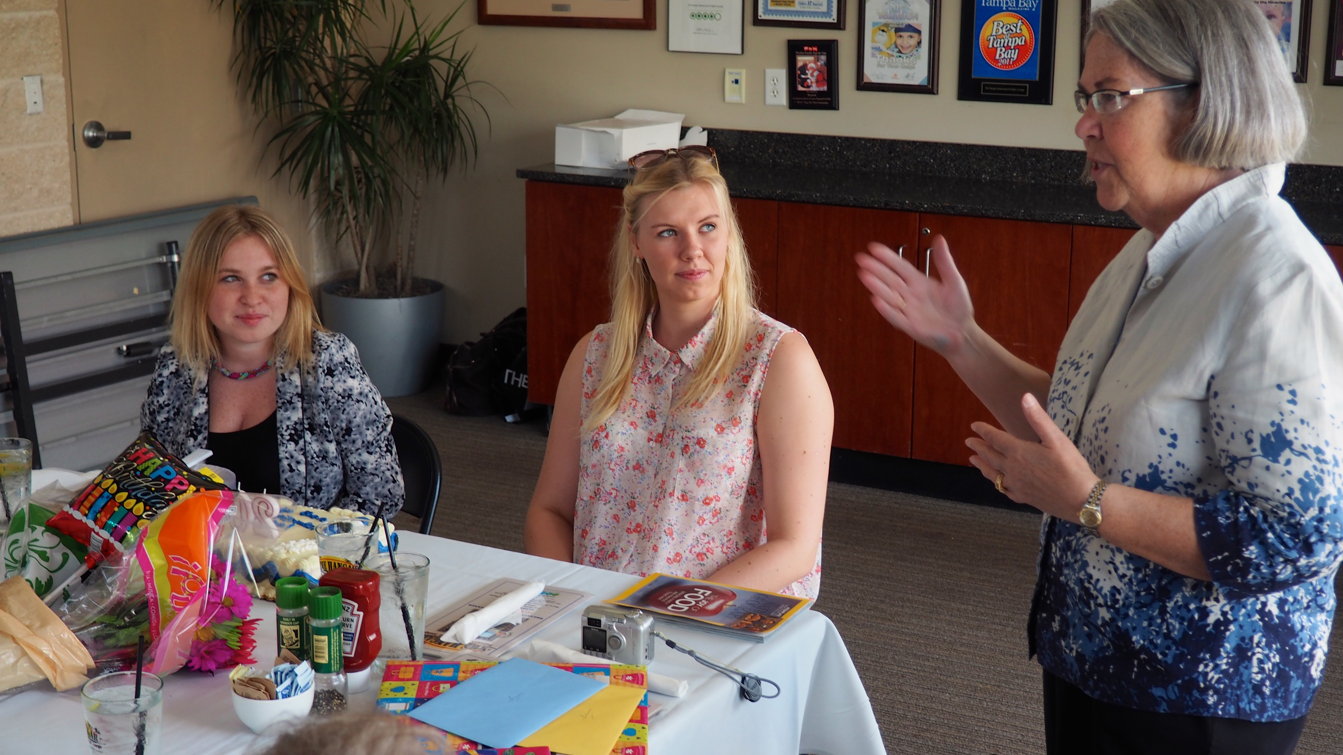KFES Vice President and Estonian Honorary Consul Lisa Mets introduces Simona Andreas and Trine Kasemägi to the membership. KFES, St. Petersburg, FL, January 4, 2015
