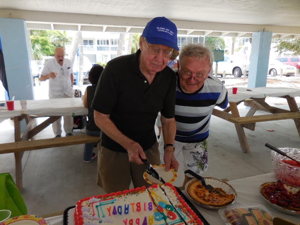 Birthday boy Jaan Kuuskvere cuts the cake under Erkki Taada’s watchful eye. KFES piknik, Anna Maria Island, 26 aprill 2015. Foto: Lisa Mets