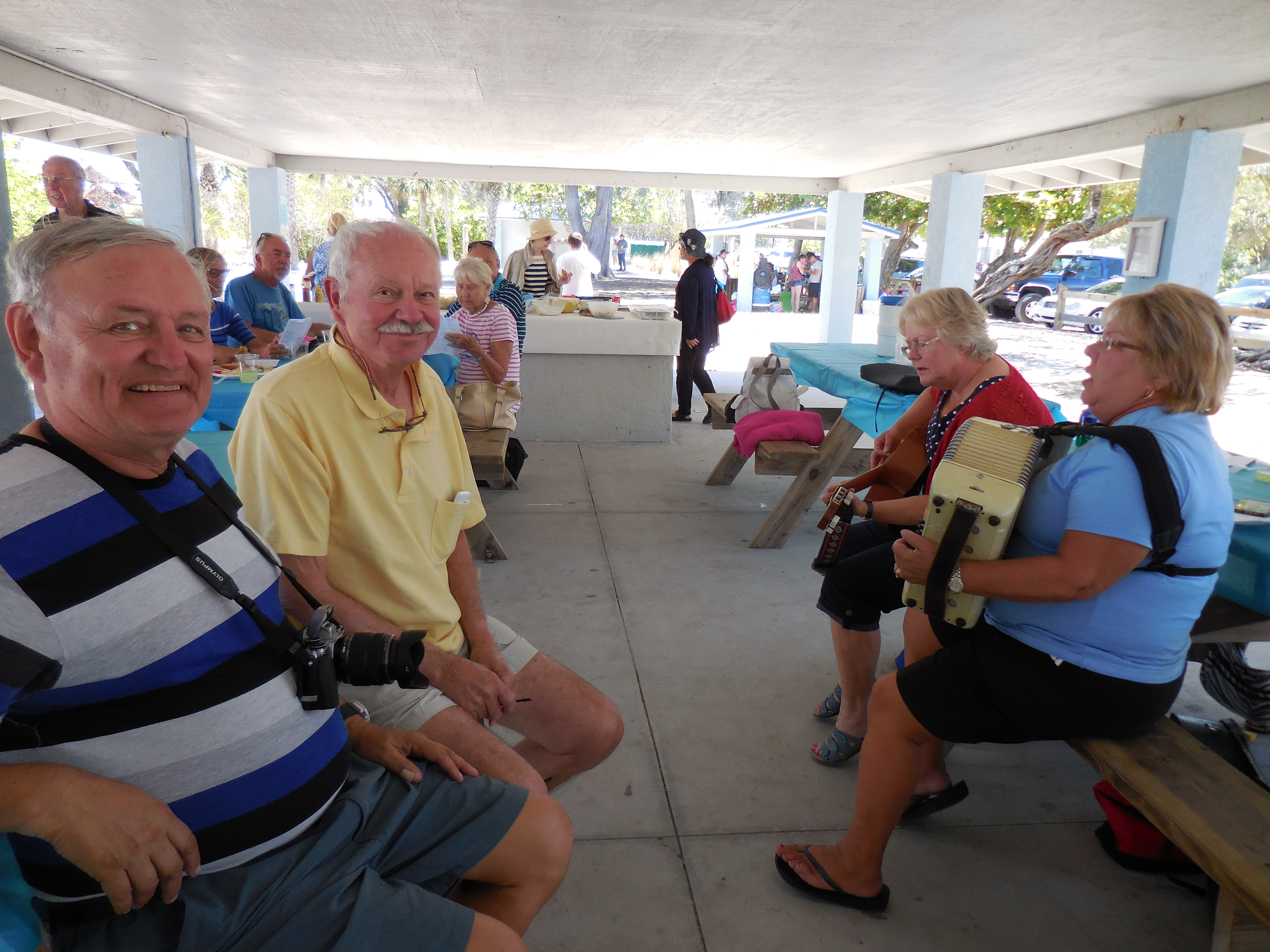 Erkki Taada, Tõnu Toomepuu, Kaie Põhi Latterner (with the accordion). Kesk Florida Eesti Selts picnic, 24. apr. 2016, Anna Maria Island, FL. Foto: Lisa A. Mets