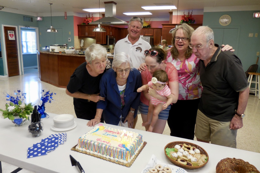 Our birthday celebrants–Maare Kuuskvere, Leena Aare, Rein Männik in the back, Brook Cabrera with mother Reet, Monika Orumaa Craig, and Jaan Kuuskvere. blow out the candles. KFES, 22 apr. 2017, Seminole, FL. Foto: Lisa Mets