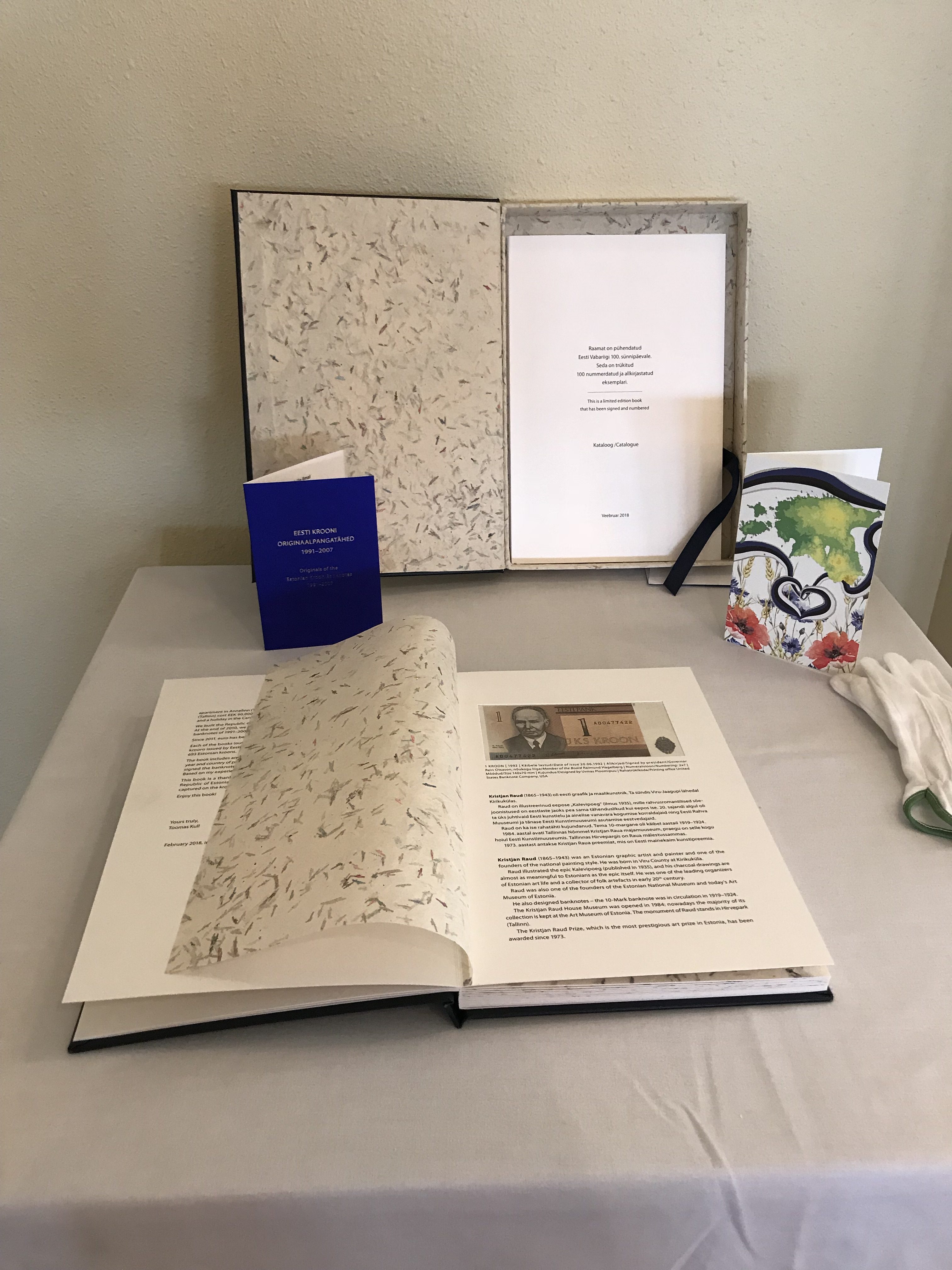 The Estonian Society of Central Florida/Kesk Florida Eesti Selts expresses deep gratitude to hr. Toomas Kull, who chose us as a recipient of his magnificent book Eesti krooni originaalpangatähed 1991-2007. The book was placed on display in a very special way in our grand ballroom. In his email to KFES, Mr. Kull wrote: Raamatu tiraaz on 100. Raamatu pühendan Eesti 100 sünnipäevaks, eestlastele endiselt OMA RAHA -EESTI KROONI -ja krooni paberraha esikülgedel olnud persoonide mälestuse hoidjatele. Igas raamatus on 8 originaal paberraha 1-500 kroonini. Raamatu vahelehed on valmistatud käsitööna Nepaalis ja vahelehed sisaldavad purustatud eesti krooni paberrahade puru. Raamatud pühendan ja kingin eesti muusemidele, seltsidele, koolidele, kellel on side krooni paberrahadel olnud persoonidega: Kristjan Raud, Karl Ernst von Baer, Paul Keres, Jakob Hurt, Anton Hansen Tammsaar, Rudolf Tobias, Lydia Koidula, Carl Robert Jakobson. Otsustasin, et lisaks soovin 15 raamatut kinkida nendele kaasmaalastele, kes kodumaalt eemal. Nii et ühe raamatu soovin pühendada Kesk Florida Eesti Seltsile. Raamatule on teinud karbi näol pesa karbikunstnik Katrin Raud. Karbi sisemus on vooderdatud eesti krooni paberraha purust valmistatud dekoratiivpaberiga. Soovin, et saadate mulle operatiivselt korrektse Kesk Florida Eesti Seltsi postiaadressi ja kontaktisiku telefoni numbri. Seda kõik selleks, et krooniraamat jõuaks 24 veebruariks ka teie seltsimajja, Eesti sünnipäeva pidulistele rõõmu valmistada! Eestimaa ilu hoieldes! Toomas Kull