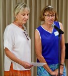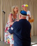 - Latvian host Dace Nebare presents a bird whistle prize to Estonian Kaie Põhi Latterner. Latvian Ligo/Estonian Jaanipäev celebration. June 22, 2019. St. Petersburg, FL. Foto: Erkki Taada