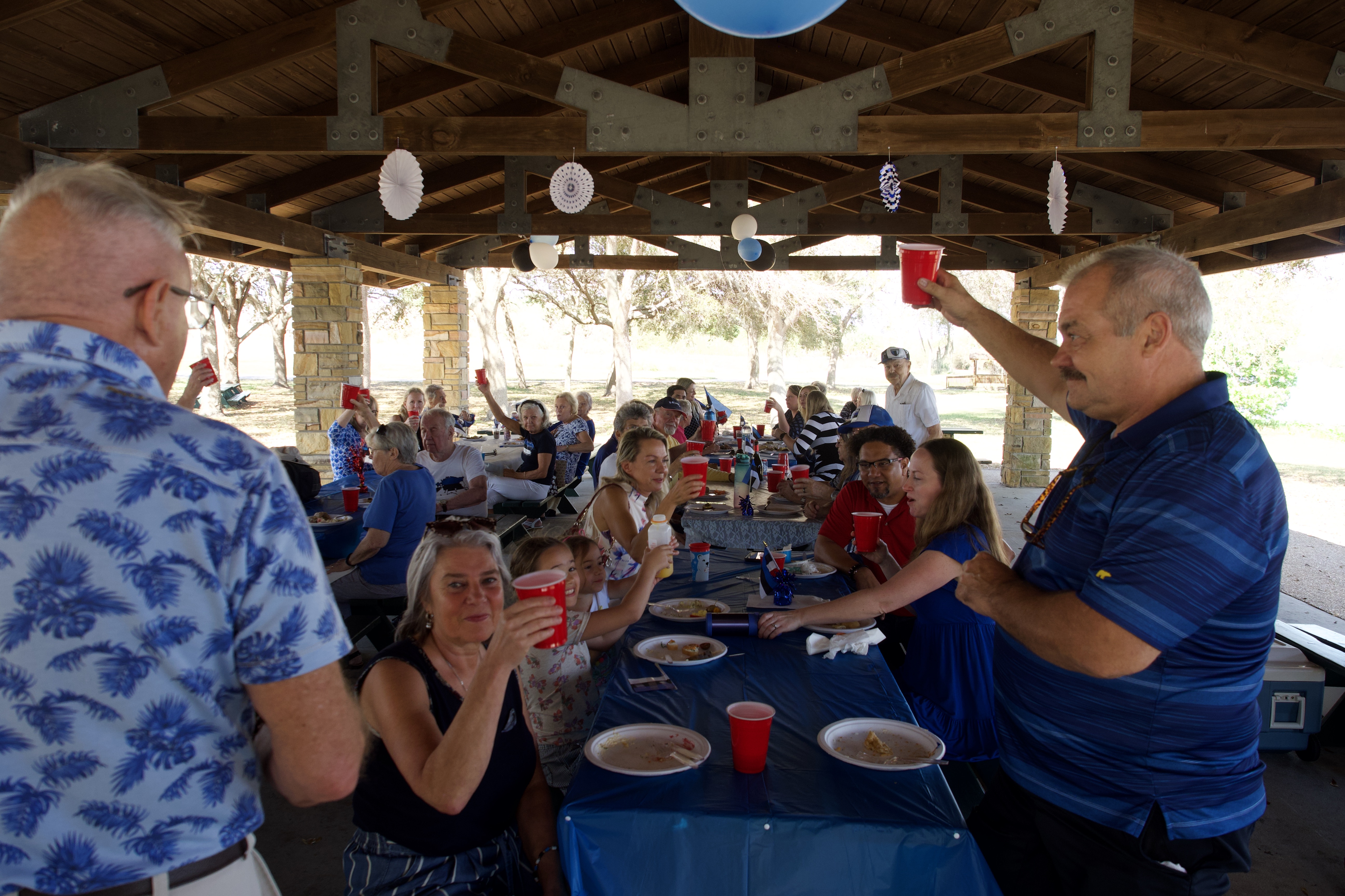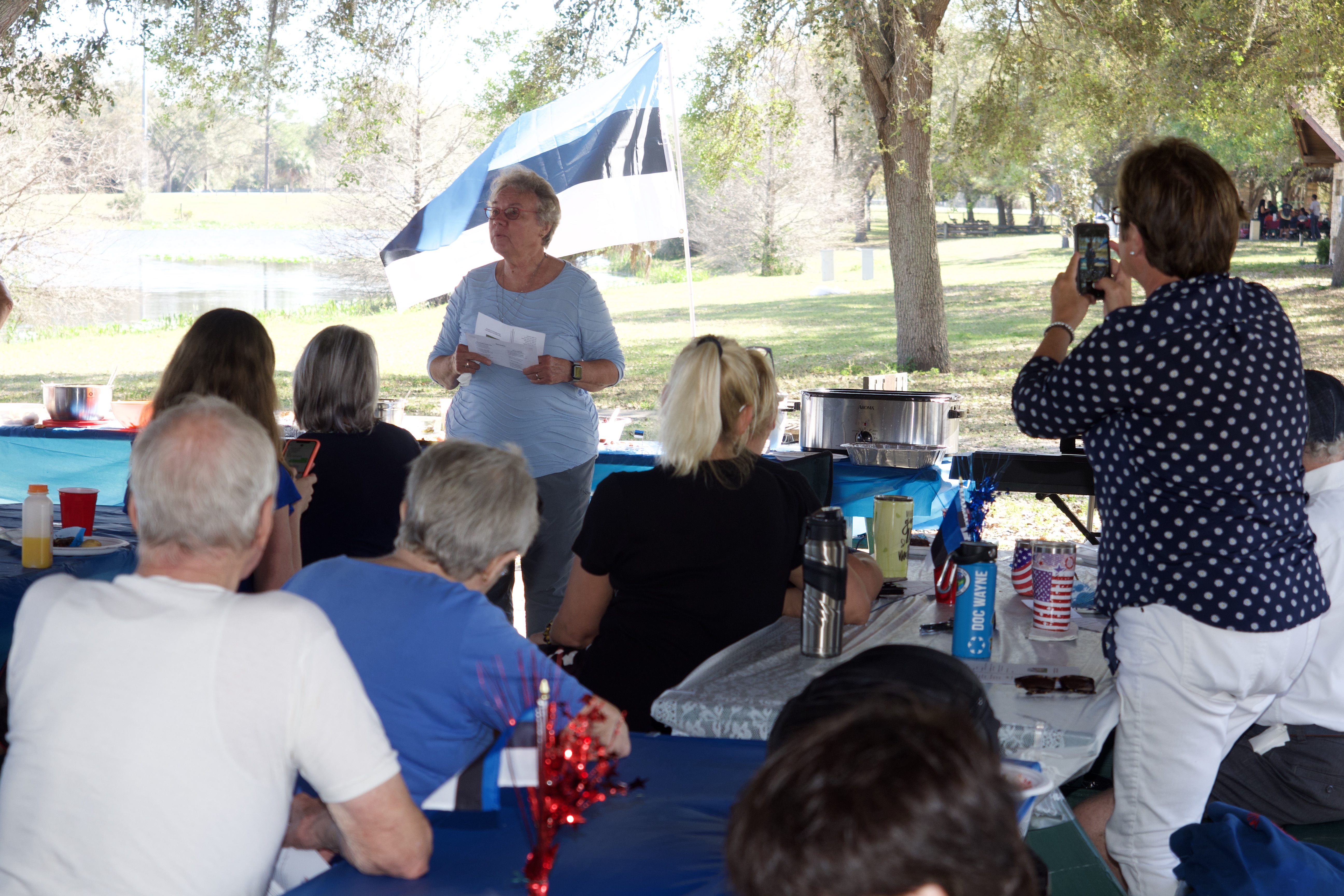 KFES President Merit Laansalu (far left) opens our EV104 program. Kesk Florida Eesti Selts EVA104 Piknik. 27. veeb. 2022.a. Walsingham Park, Seminole, FL. Foto: Erkki TaadaLed by Vincent Delaidatti, together we sing the US National Anthem. Kesk Florida Eesti Selts EVA104 Piknik. 27. veeb. 2022.a. Walsingham Park, Seminole, FL. Foto: Erkki TaadaFormer KFES President Kersti Totsas Linask brings greetings from the Washington DC eesti selts, her new home. Kesk Florida Eesti Selts EVA104 Piknik. 27. veeb. 2022.a. Walsingham Park, Seminole, FL. Foto: Erkki TaadaHeinar Normet leads us in our toasts. First a toast to Ukraine. Then a toast to Eesti. Kesk Florida Eesti Selts EVA104 Piknik. 27. veeb. 2022.a. Walsingham Park, Seminole, FL. Foto: Erkki TaadaOn behalf of KFES, Eesti Aukonsul Kaie Põhi Latterner thanks the Vaikmaa family (Märten in the dark blue shirt is third from right) for hosting past KFES events (Jaanipäev and Taasiseseisvuspäev) at their beautiful home. Kesk Florida Eesti Selts EVA104 Piknik. 27. veeb. 2022.a. Walsingham Park, Seminole, FL. Foto: Erkki Taada