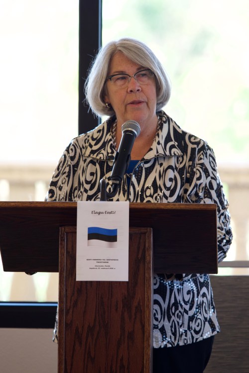KFES esinaine Lisa A. Mets offers a welcome and remarks about the 100th anniversary of the Tartu Peace Treaty. Kesk Florida Eesti Selts EVA 102 tähistamine. 22. veeb. 2020. Clearwater, FL. Foto: Erkki Taada