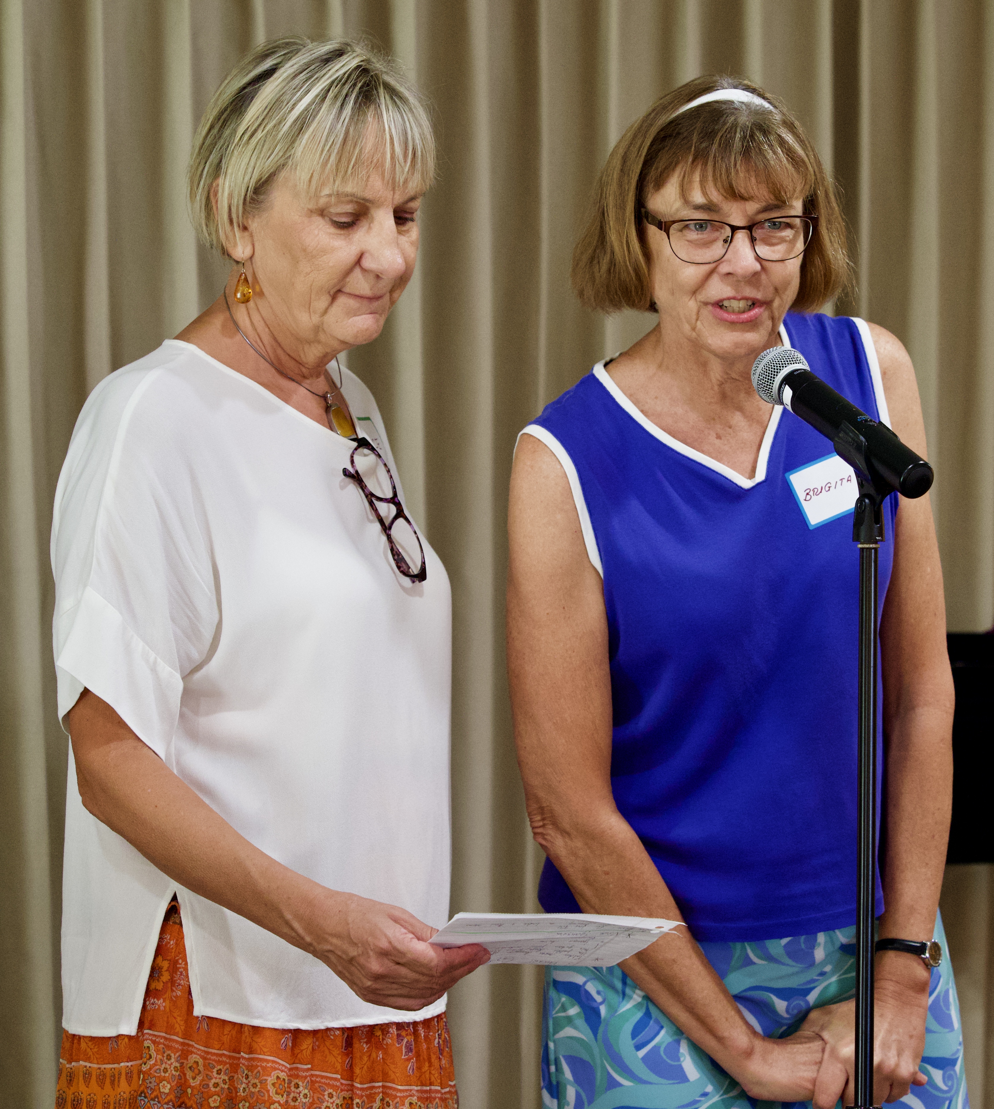Latvian host Dace Nebare and a translator. Latvian Ligo/Estonian Jaanipäev celebration. June 22, 2019. St. Petersburg, FL. Foto: Erkki Taada