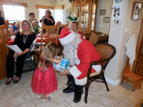 Curious Chloe Cabrera wonders what special gifts Jöuluvana has for her. Estonian Society of Central Florida Christmas Luncheon/KFES Jõululõunasöök, 9. dets. 2017, North Redington Beach, FL. Foto: Lisa Mets