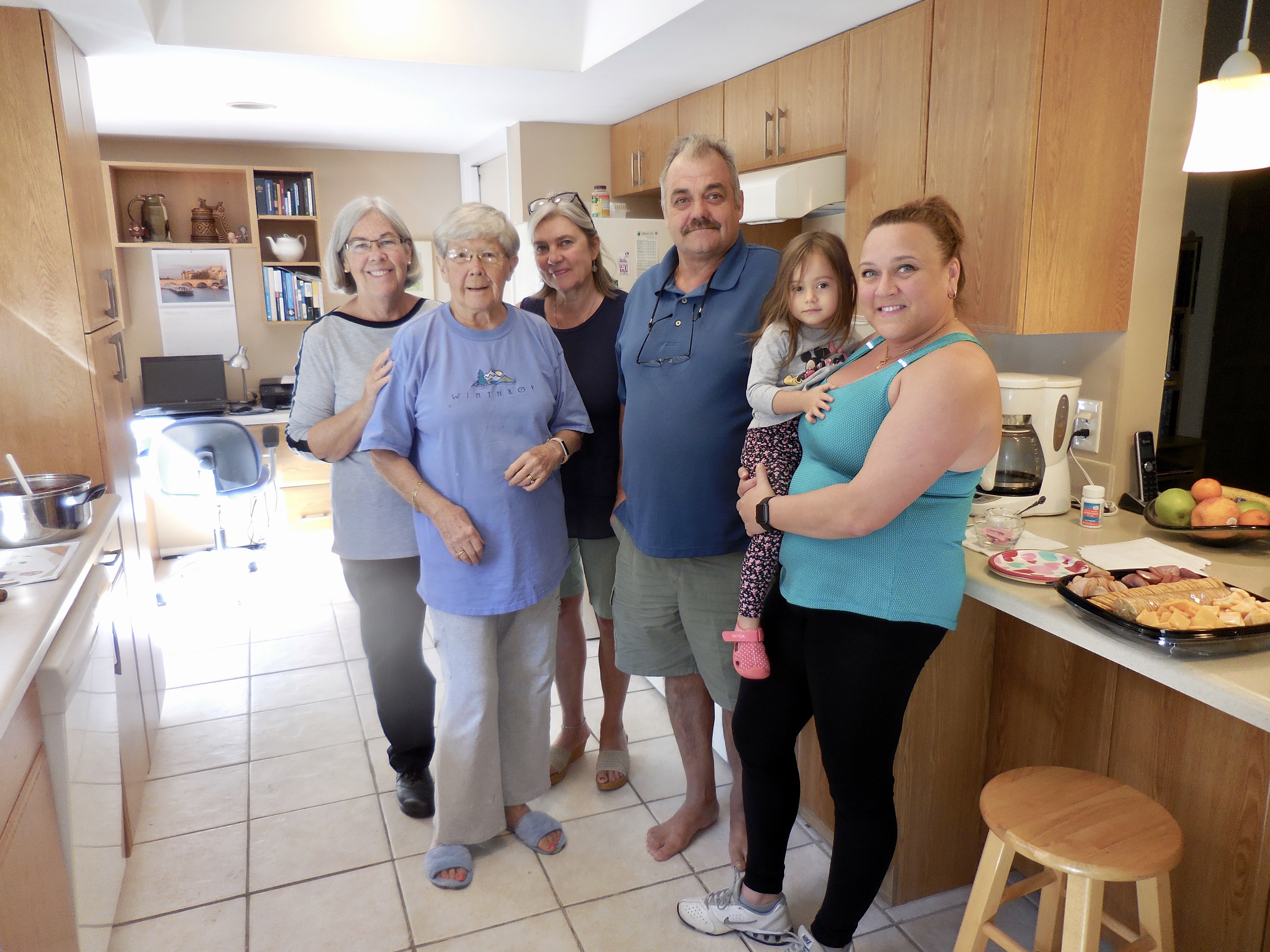 Pause for a group photo. Lisa Mets, Maare Kuuskvere, Astrik ja Heinar Normet, Brook Cabrera ja Marju Dishmey. Kesk Florida Eesti Seltsi jõuluvorsti talgud. 17. nov. 2018.a. Bradenton, FL. Foto: Regina Reet Cabrera