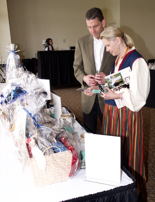 Linda Lepik and her husband Donald Johnson. look over the loterii baskets. Kesk Florida Eesti Selts EV100. Clearwater, FL. March 10, 2018. Photo: Erkki Taada