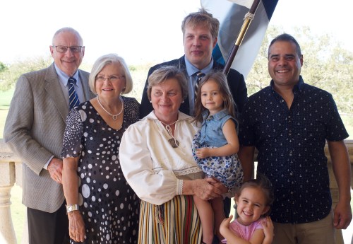 Heikki and Inne Joonsar, Andres Olvet with the flag, Anneliis Kuusik with Brook Cabrera, Erik Cabrera and Chloe Cabrera in the front. Kesk Florida Eesti Selts. EV101. 23. veeb. 2019.a. Clearwater, FL. Foto: Erkki Taada