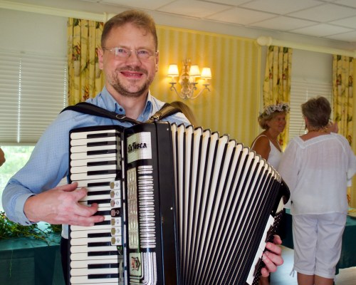 Our Latvian accordionist Kaspars works the room. Latvian Ligo/Estonian Jaanipäev celebration. June 22, 2019. St. Petersburg, FL. Foto: Lisa A. Mets