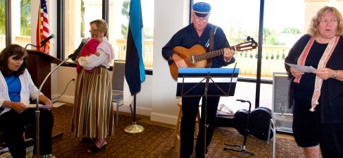 Gloria Leppik, Anneliis Kuusik, Rein Männik, and Piret Komi lead ühislaulud. Kesk Florida Eesti Selts EVA 102 tähistamine. 22. veeb. 2020. Clearwater, FL. Foto: Lisa A. Mets