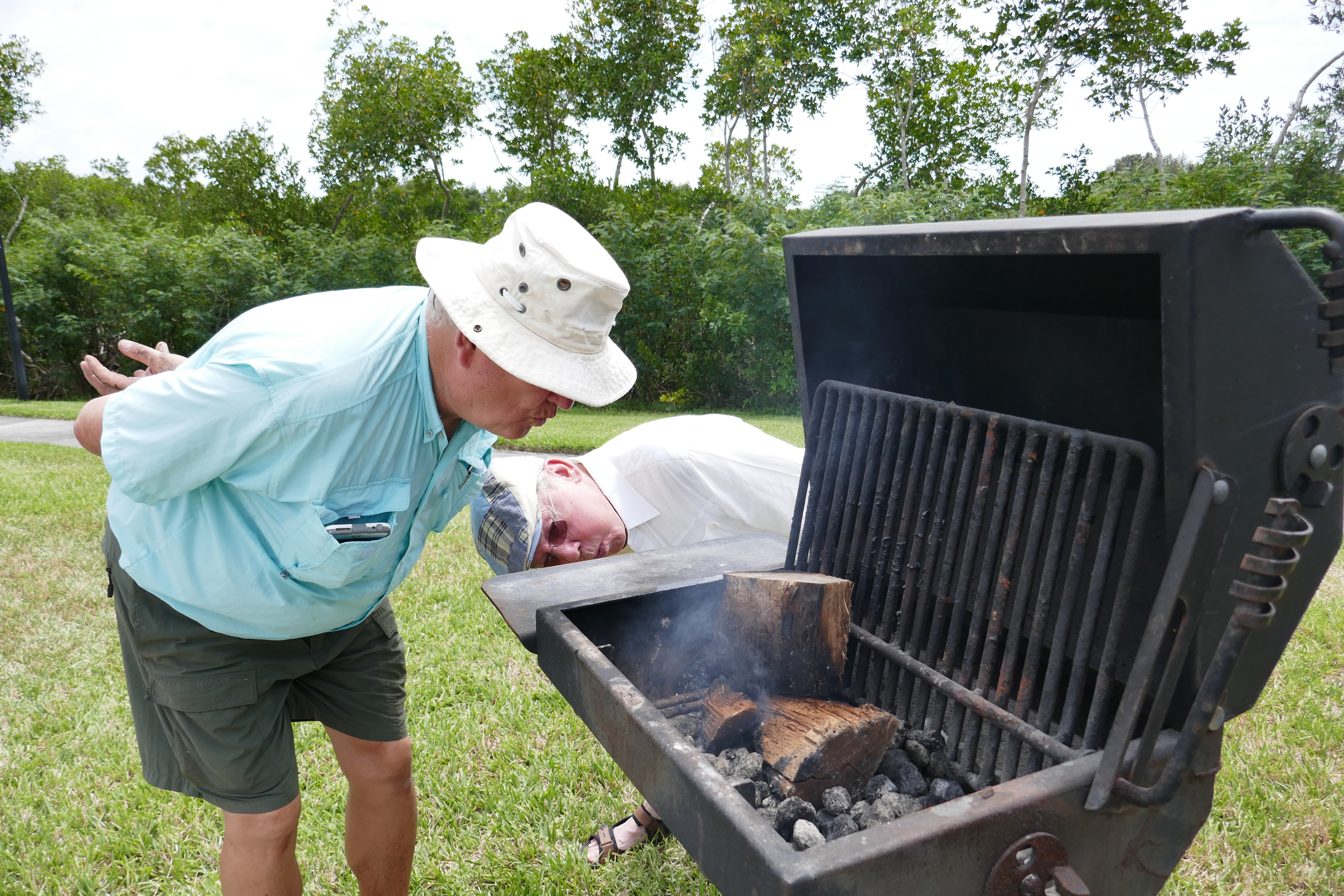 Erkki Taada and Rein Allikberg help the fire get going. Kesk Florida Eesti Selts piknik. 13. apr. 2019. Seminole, FL. Foto: Lisa A. Mets